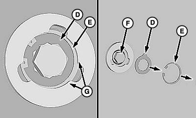 Make sure snap ring (E) is fully seated under shoulder (G) of retaining ring.