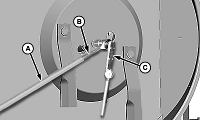 Tighten blade holder hardware to specification using a torque wrench (C), torque multiplier (B) and a long piece of pipe (A). Position pipe into a corner of the machine.