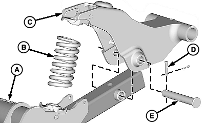 Remove cotter pin and pin (D), pivot pin (E) and wheel arm (C) from axle strut.
