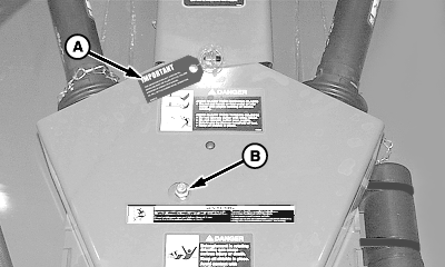 Remove dipstick/vent (B) and discard shipping tag (A).